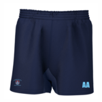 Navy shorts with printed initials and embroidered badge